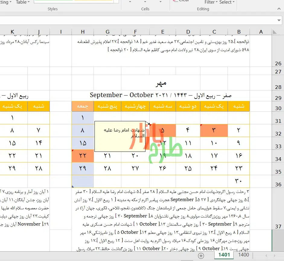در این فایل بیش از 200 مناسبت فهرست شده است. سال 1401 هجری شمسی سال ببر بوده و در ساعت ۱۹ و ۳ دقیقه بعد از ظهر روز یکشنبه ۲۹ اسفند ۱۴۰۰ هجری شمسی تحویل خواهد شد.