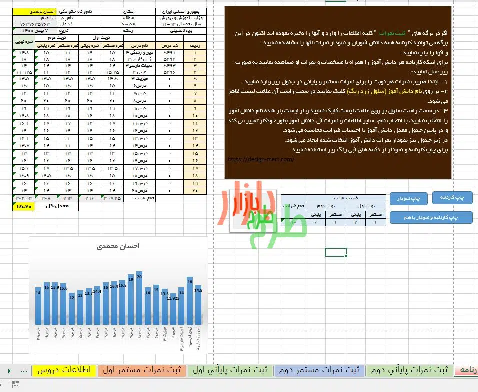 کارنامه اکسل نمرات مستمر و پایانی نسخه پیشرفته